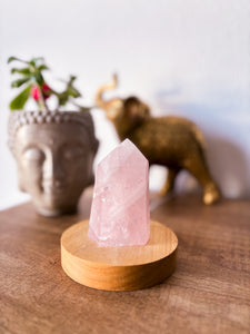 Contenido: Obelisco de cuarzo rosa, base de madera y cable USB